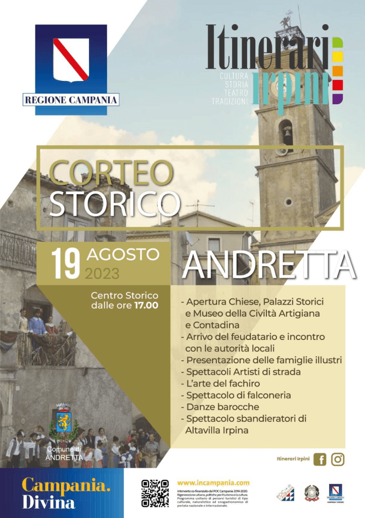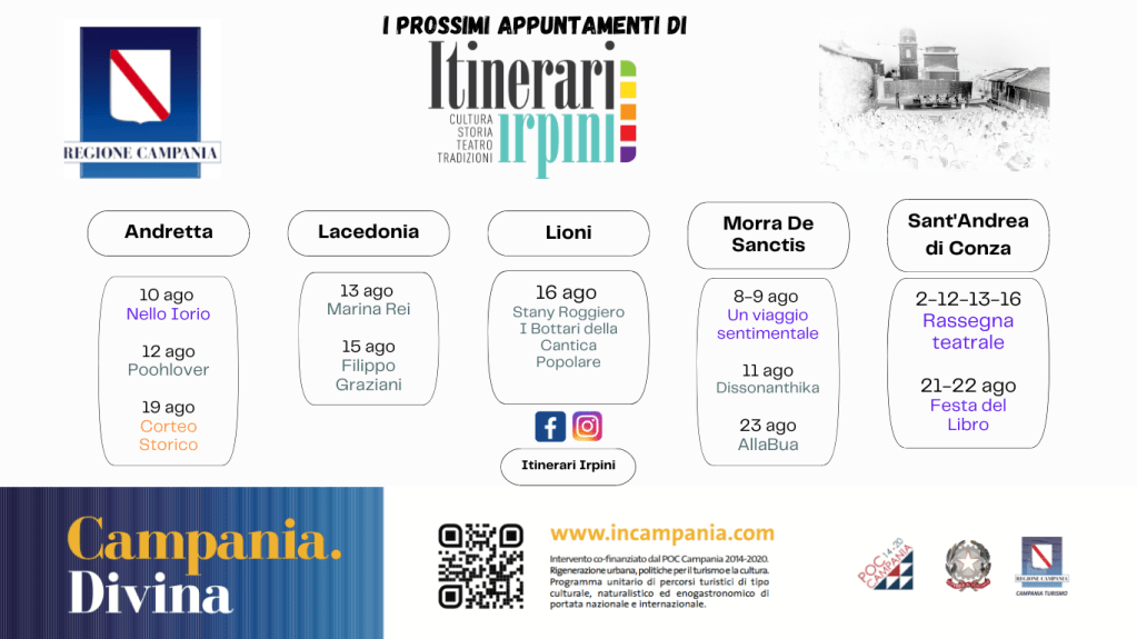 La nuova edizione 2023 di Itinerari Irpini è realizzata in collaborazione con i Comuni di Andretta, Conza della Campania, Lacedonia, Lioni, Morra De Sanctis e Teora.