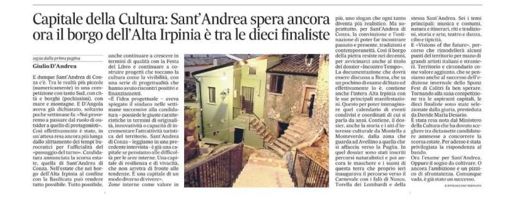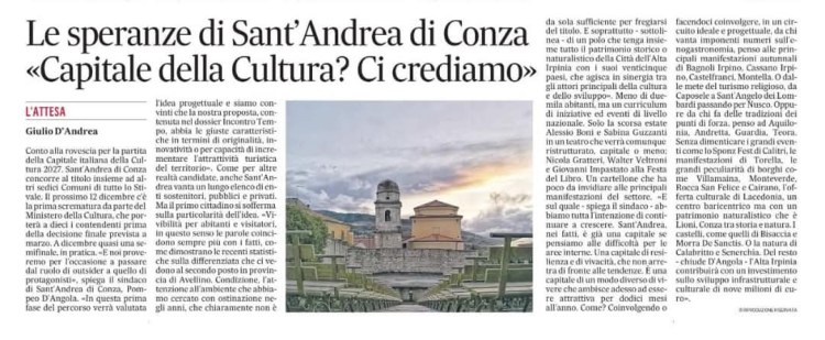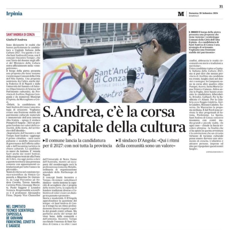 Sant’Andrea di Conza è candidata a Capitale italiana della Cultura 2027 con la creazione di un circuito culturale stabile e innovativo nel cuore dell’Alta Irpinia. Il 26 febbraio 2025, nella Sala Spadolini del Ministero della Cultura, abbiamo raccontato in audizione, davanti alla commissione, il progetto Incontro Tempo, che unisce 25 Comuni e altre 70 realtà: un mosaico di storia, arti e natura, un’esperienza unica tra enogastronomia e tradizioni.